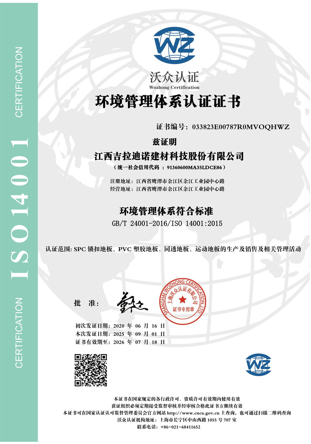 環(huán)境管理體系認證證書